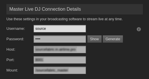 Airtime supports live input from almost any Icecast-compatible third party software, like Mixxx for example. This is perfect for seamlessly cutting from your scheduled content to an on-location interview, live DJ set, or any other real-time event. Airtime has two levels of input stream priority: Show Source, which enables a specific person to stream in during their own show, and Master Source, which can override Show Source if necessary. If neither type of live input is available, Airtime will fall back onto Scheduled Play.