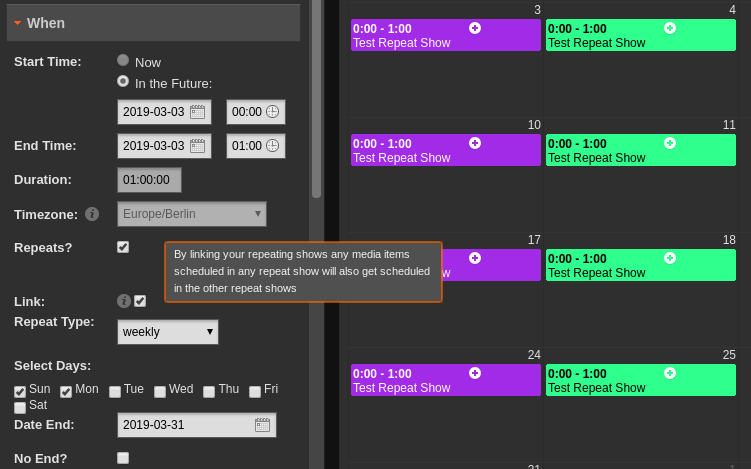 Show linking allows you to create recurring shows that share the same template. Creating a smart block in one show and linking it to others will dynamically generate scheduled content for each subsequent show based on the criteria of the original. This is great for things like “overnighters” where you might not want to program specific content but you certainly don’t want to go off air.