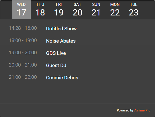 Don’t touch that dial! Airtime Pro includes a schedule widget for your website or blog too, with just a one-line snippet of code. No more laborious filling in of external calendars by hand, or lengthy text programs on websites. For advanced users, Airtime Pro offers standalone schedule widget. With these widgets you can display information on your website about: