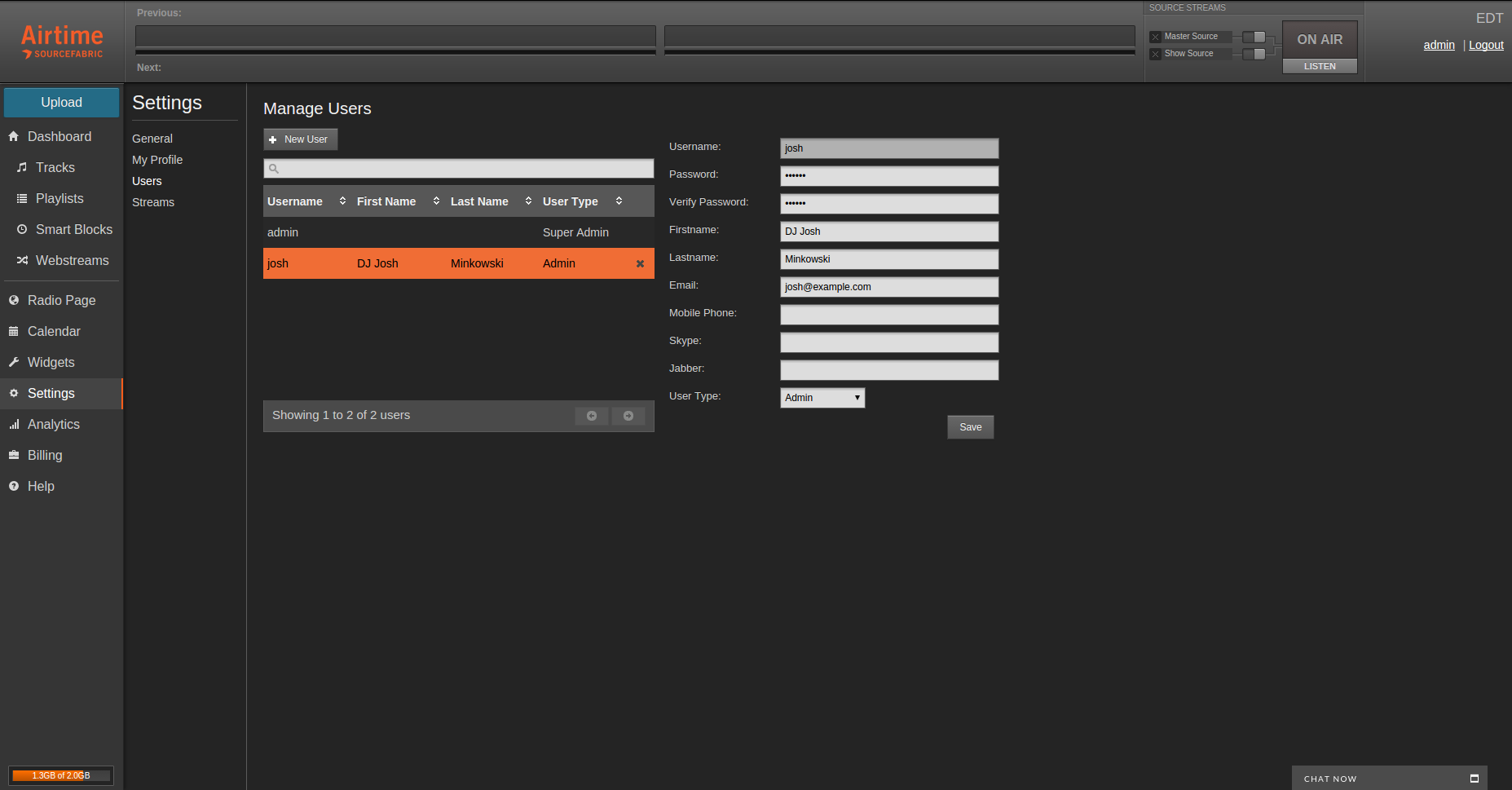 Airtime’s advanced user management allows station managers to set a hierarchy for staff and allocate the control of their broadcast slots to them.