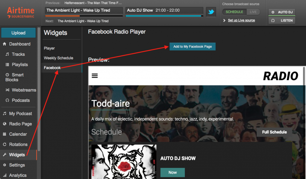 Link your station’s Facebook page in the same way, by replacing Airtime Pro’s address with your own. We also have a special widget that allows fans to listen to your radio station directly from your Facebook page. To set it up, go to “Widgets” and select “Facebook” (see below), and then click “Add to my Facebook”. One caveat, Facebook recently changed their policies regarding third-party apps, so you now must sign your station up on a business account or as a community page, and the widget won’t work there unless you have a minimum of 2,000 followers.