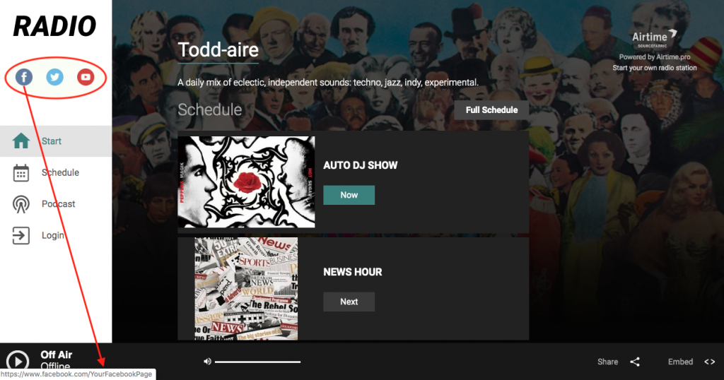 When you go to your station’s Radio Page, you’ll see (below) icons for Facebook, Twitter and Youtube in the upper left corner of the page. You can see that the change occurs instantly by waving your cursor over the icon, and the new address will be highlighted in the bottom left corner.
