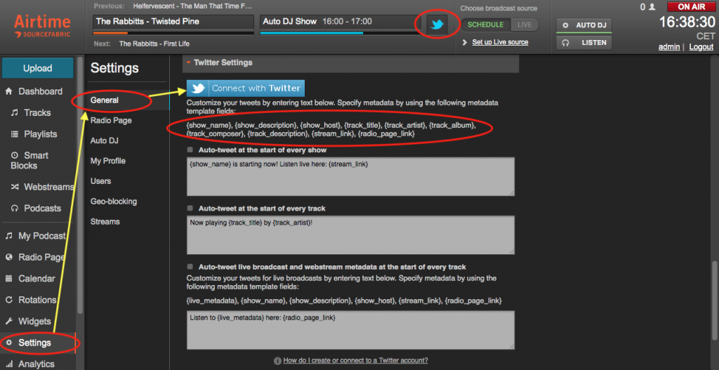 For Twitter, once you’ve linked your account, go to Settings > General and scroll down to the Twitter Settings (see below). Here, you can select options to auto-tweet so that followers will automatically get a Twitter alert at the start of each track or when a new show is starting. These auto-tweets can be customized by pulling info from the song or show’s metadata using brackets — i.e. {show_name} is starting now! Listen live here: {stream_link} — which can be used alongside your own writing to craft messages that are on target with your brand.