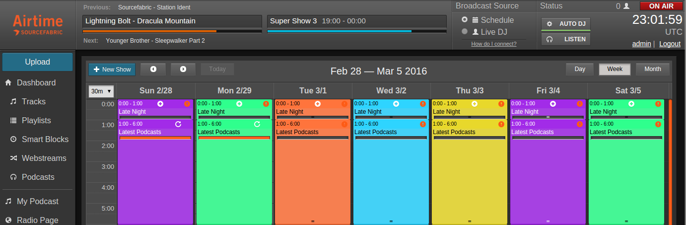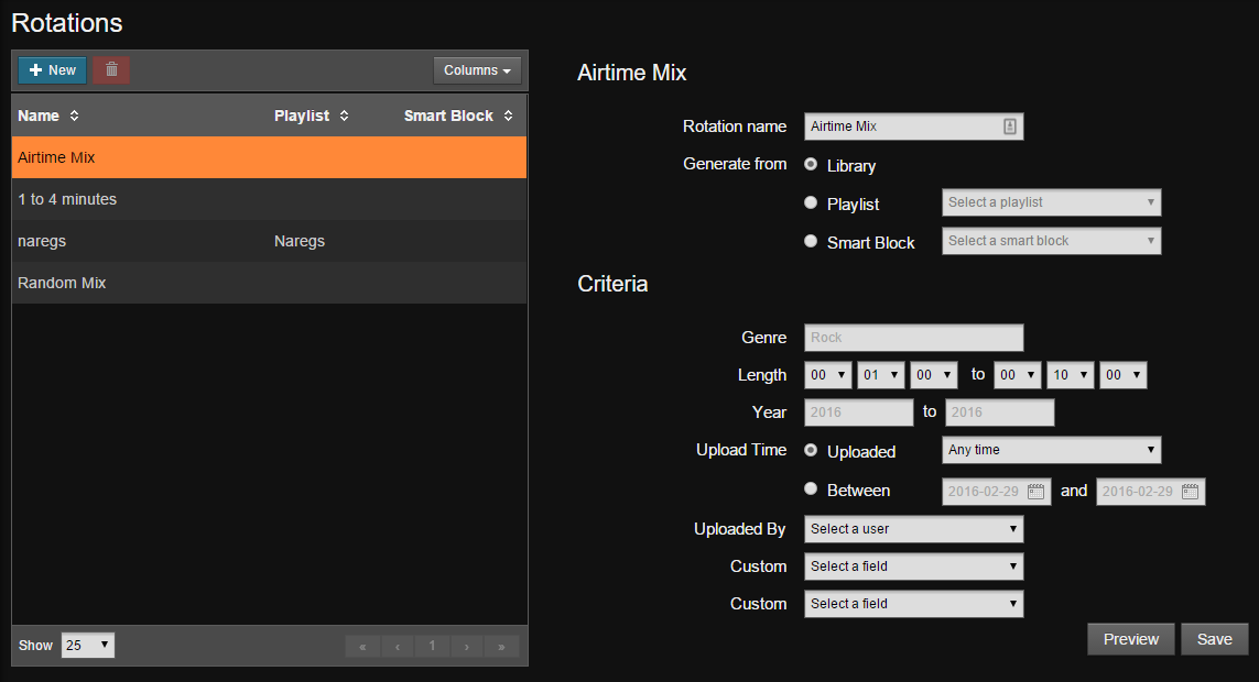 We’re pleased to unveil a new feature called “Rotations”, which brings improved automatic scheduling to your station. A rotation consists of a repeating playlist that automatically pulls content from your library to fill shows with tracks. Rather than scheduling tracks by hand, Airtime Pro can now generate your shows an hour before they start, so that they can automatically include your latest uploads. Better yet, rotations can be combined with smart blocks to automatically schedule your latest uploads or podcasts with ease.