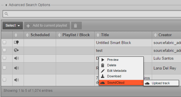 Airtime Pro now lets you upload tracks from your library directly to your station’s SoundCloud page. If you frequently broadcast full, pre-produced radio shows, this new feature can help you streamline your audio publishing workflow. Title, genre, and year metadata are passed along to SoundCloud to save you time, and you can set a default visibility and license for new uploads in the preferences.